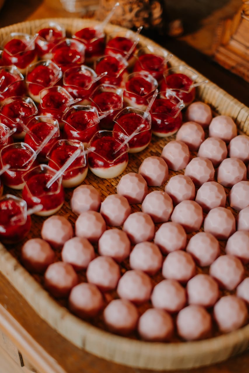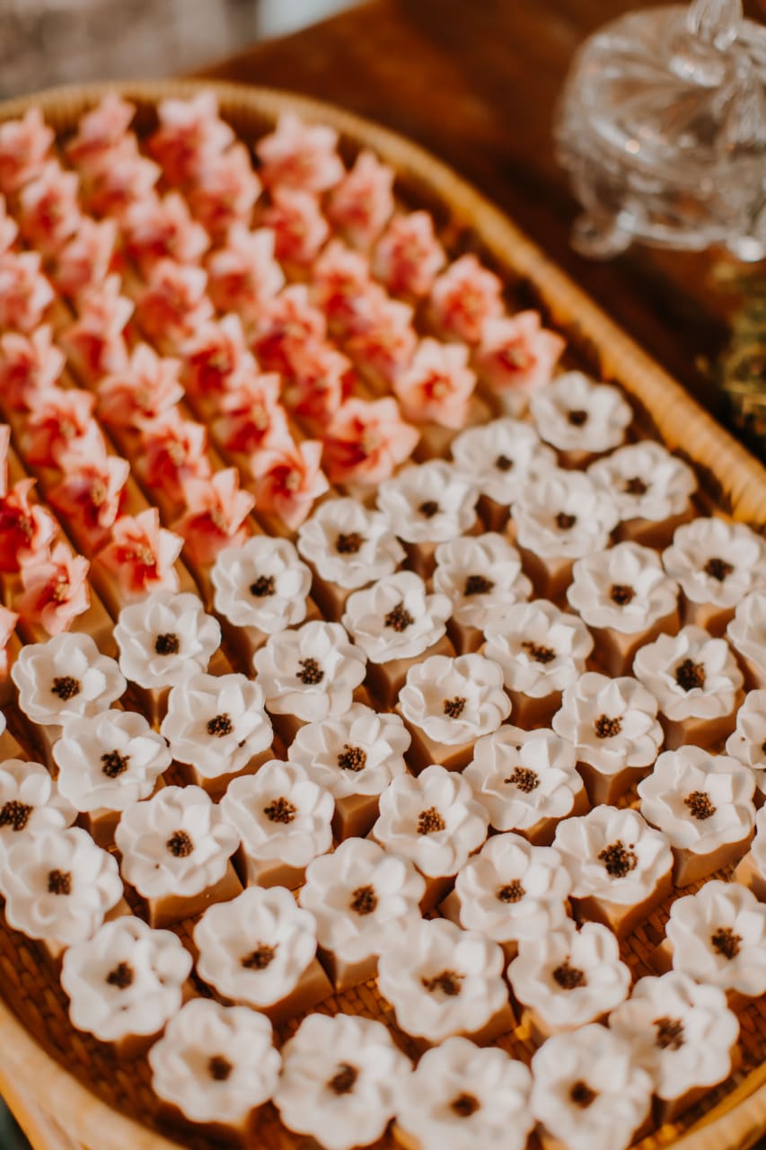 Os docinhos lindos e deliciosos ficaram por conta da Martha Deveza, que seguiu a paleta de cores do casamento, e também é possível ver referências orientais para seus doces personalizados.