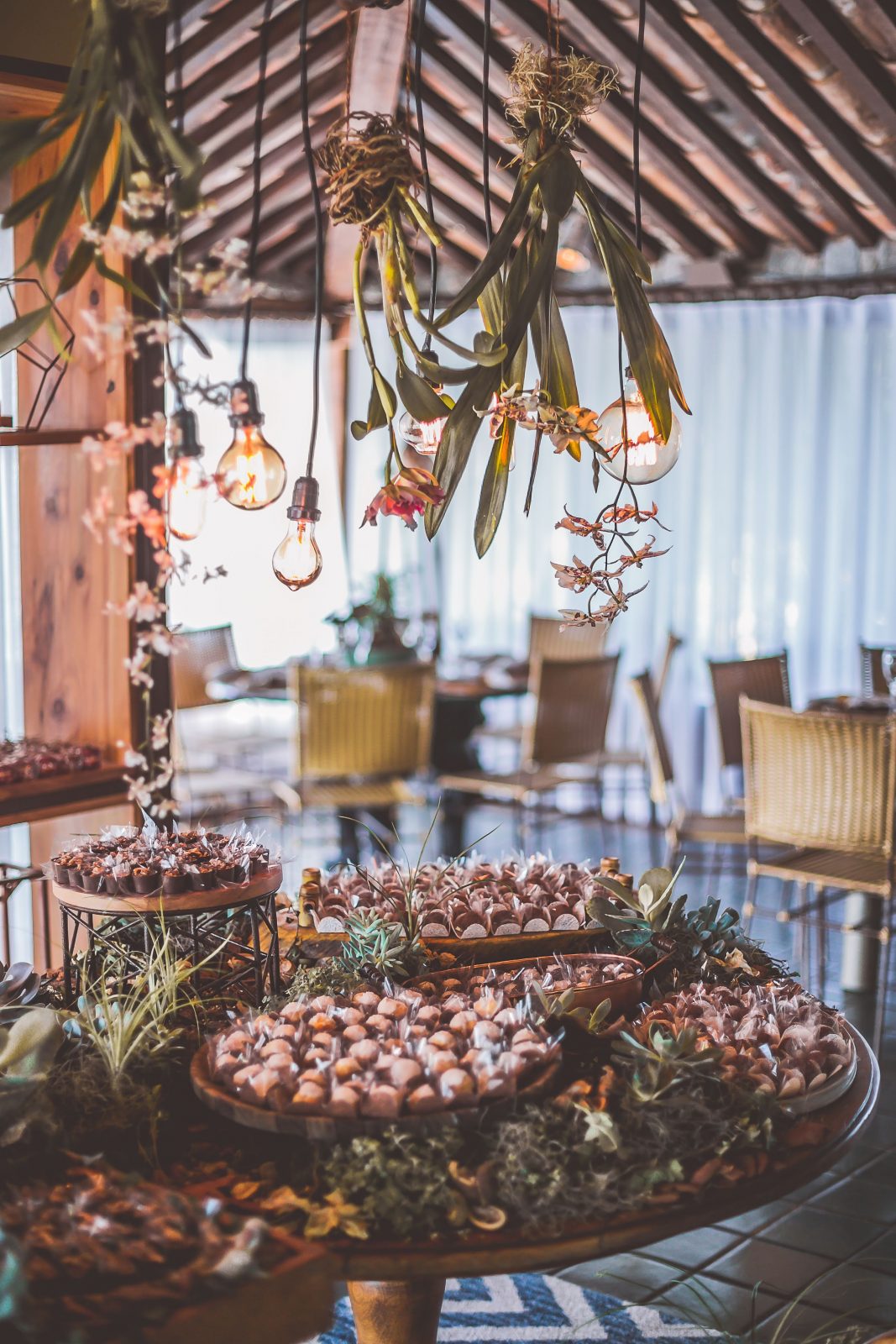 O grande dia aconteceu em um espaço localizado de frente para a praia Brava. A decoração ficou por conta da Dolce Momento, que assinou uma decor totalmente orgânica, nas cores de tons verde, branco e toques em azul. Para essa decor personalizada, a mesa de doces passou a ser um jardim de doces, com orquídeas aéreas e lâmpadas de filamentos suspensas por troncos.