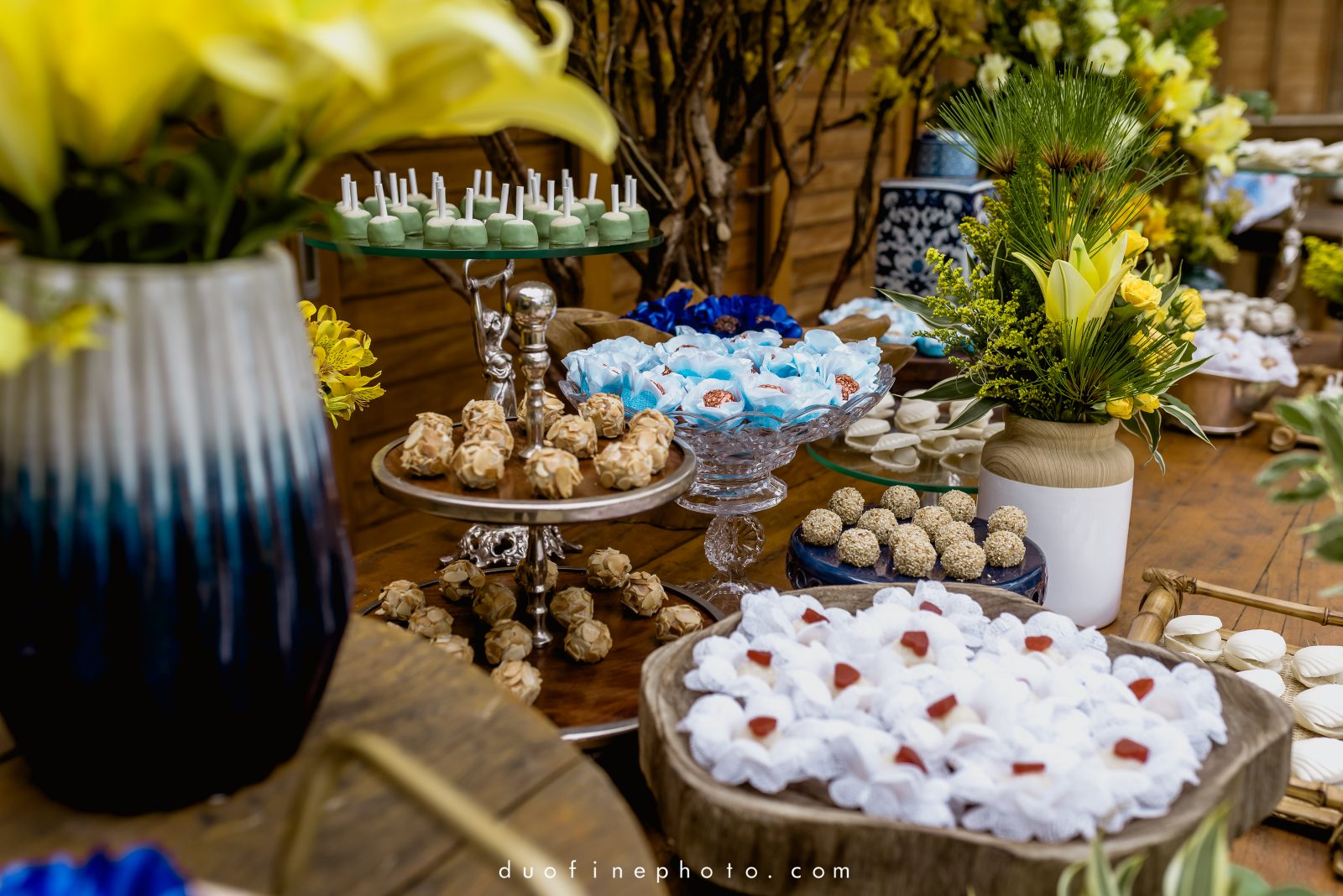 Com uma linda decor nas cores amarela e azul marinho assinada também pela Andrea Rodrigues, queremos destacar o altar, cheio de girassol e a mesa de doces. Amamos a cerejeira de cor amarela. Achamos um charme! E falando nesse cantinho, destaque também para os doces finos deliciosos da Adriana Gregório.