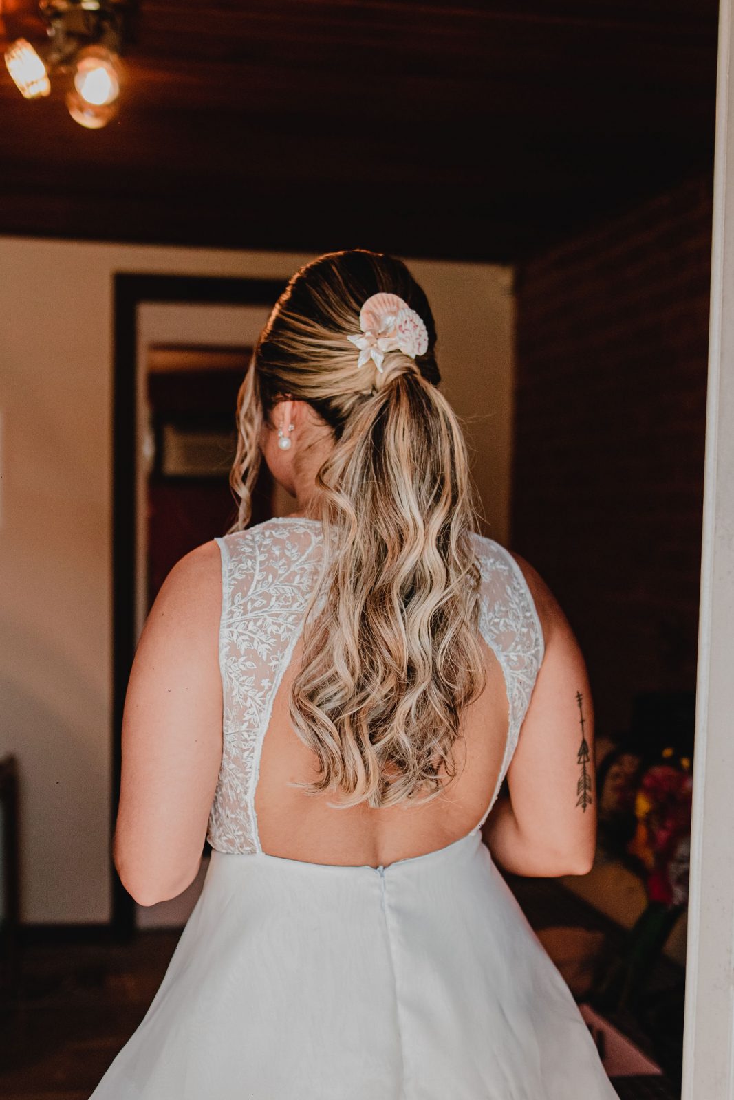 A noiva usou um vestido simplesmente maravilhoso assinado pela estilista Marcela Abdalla do Meeck Atelier. Amamos o toque de transparência no top do vestido, deu uma certa leveza e romantismo. Para compor seu visual, Marcella optou por um penteado preso com uma linda grinalda da Q.artz em formato de conchas, para combinar com o clima praiano. Nós amamos!