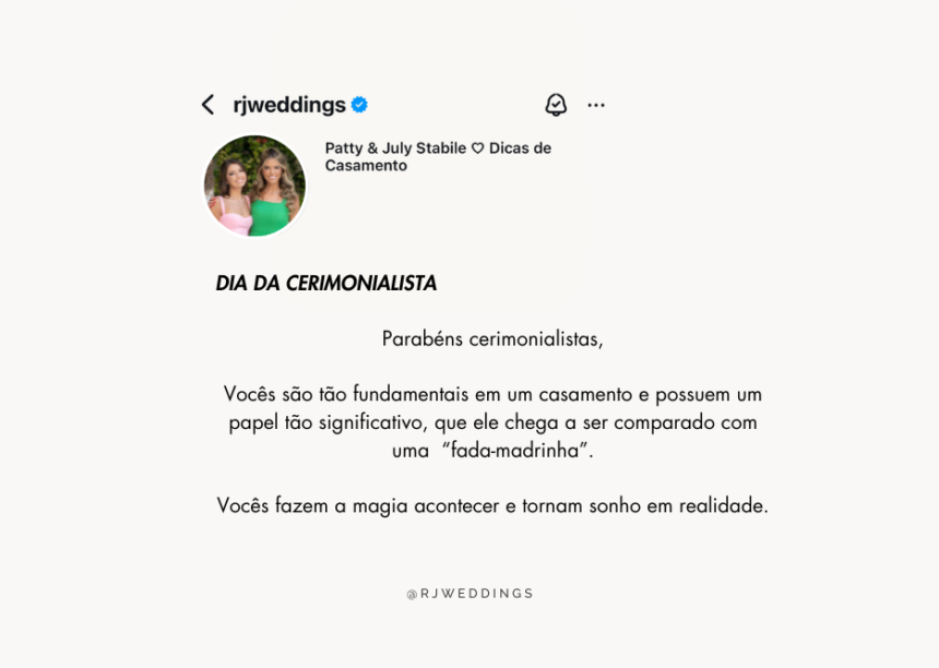 Hoje é o dia das verdadeiras fadas madrinhas, àquelas que ajudam a tornar o sonho dos noivos em realidade, o dia 29/10 é o dia dedicado especialmente para as cerimonialistas.